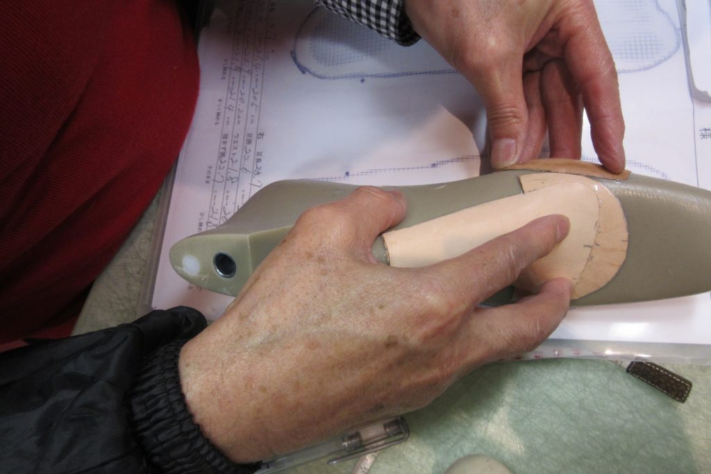大小も革の薄さも様々な物を、木型に張り付けてゆきます。